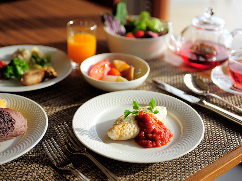 Choose your main dish and enjoy a semi-buffet featuring salads made with island vegetables, local fruits, original jams, and more for a wellness-focused morning.