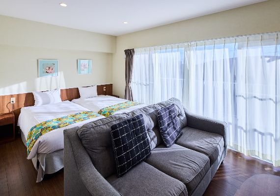 3階と4階に位置するツインルームで。シングルベッド2台とソファー設置。